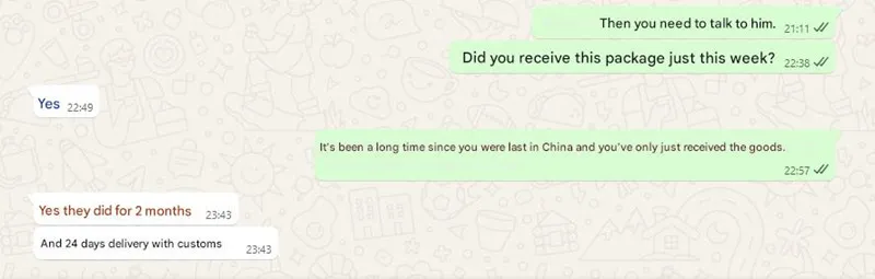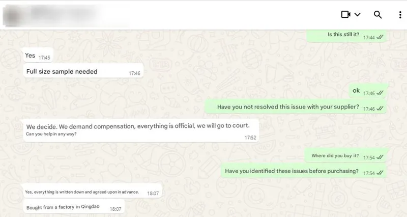 لقد علمنا مؤخرًا أن أحد العملاء واجه مشكلات خطيرة في طلب قطعة من القماش المشمع من أحد المنافسين. لقد تم إغراءهم بالسعر المنخفض، واستغرق المصنع في النهاية شهرين لإكمال الإنتاج. عند التسليم، اكتشفوا أن المنتج قد نفد من المخزون وليس بالحجم الذي اتفقوا عليه في الأصل. يفكر العميل حاليًا في اتخاذ إجراء قانوني. وفيما يلي نص من اتصالاتي مع هذا العميل.